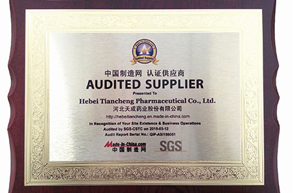 In order to show the enterprise image of Hebei Tiancheng Pharma on B2B website Made-in-China.com, SGS audited enterprise site and issued positive and dependable results. SGS Audited Supplier Certificate was approved.